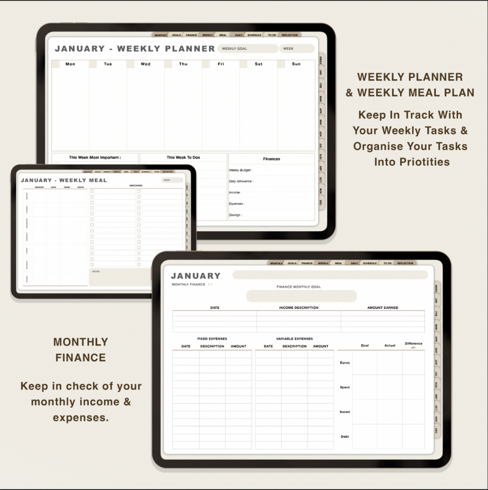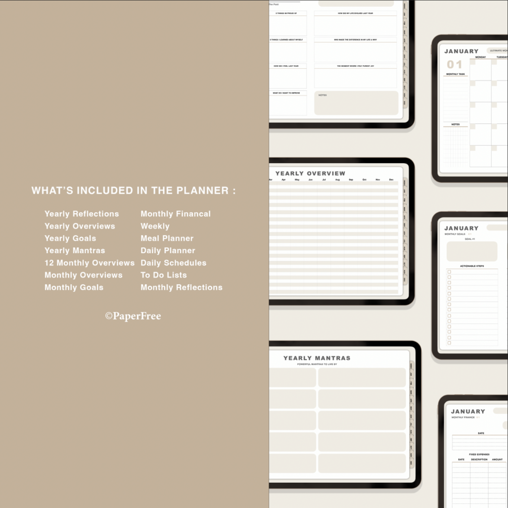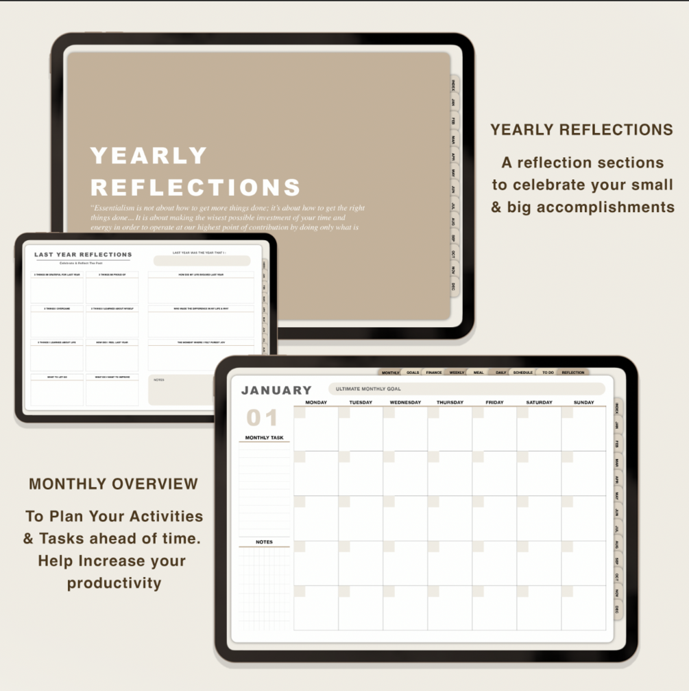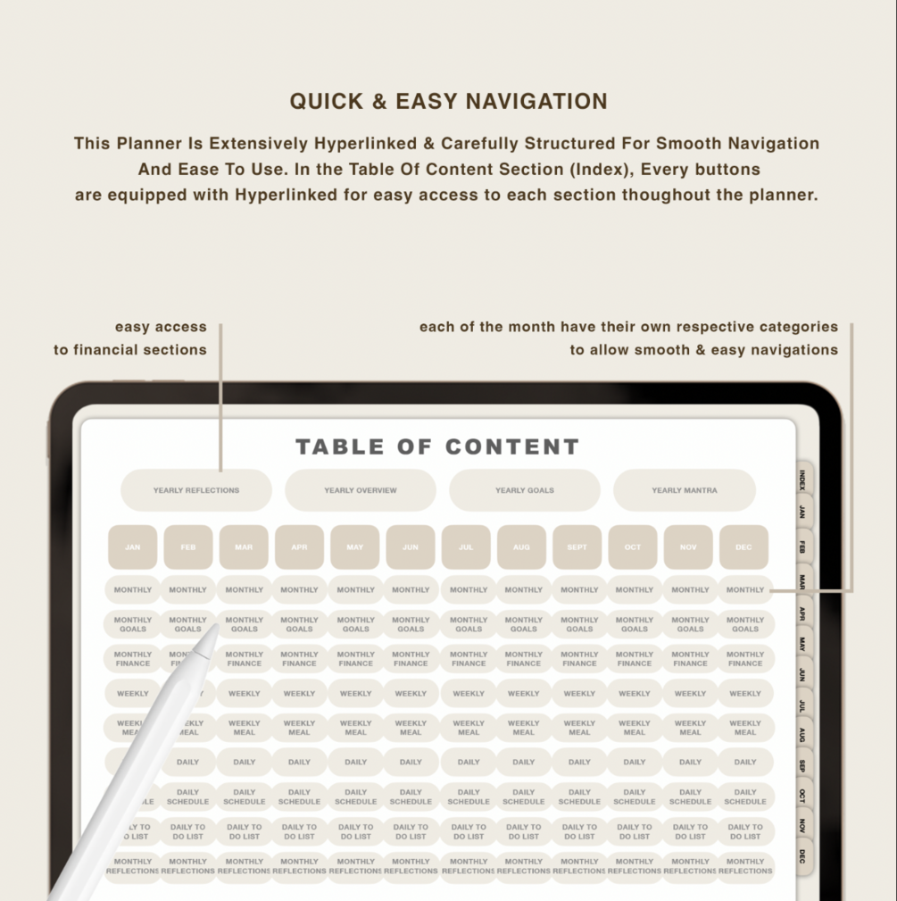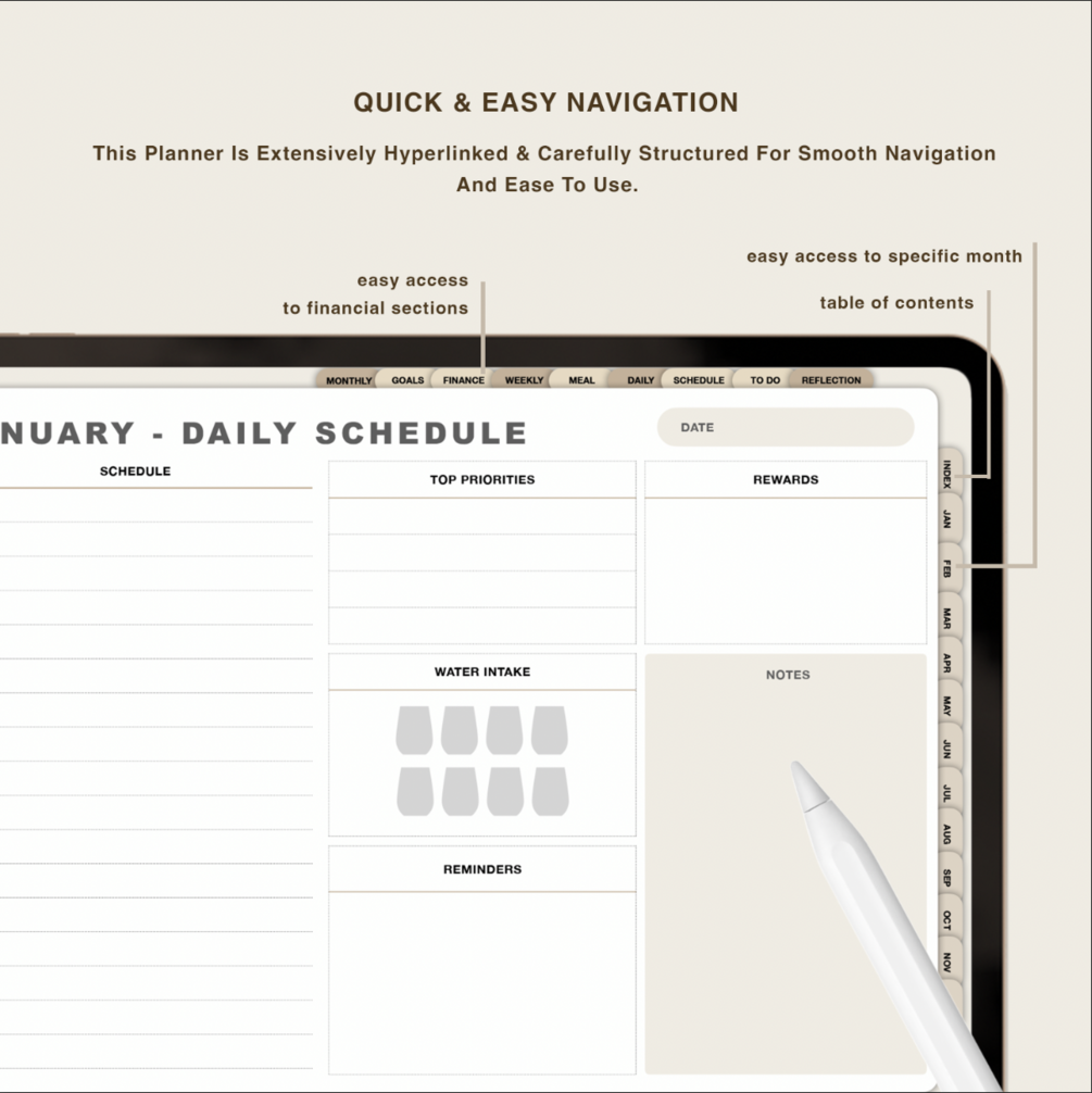 The All-in-one digital planner has been carefully designed to maximize productivity, aid in achieving all the goals that you set for yourself, and ultimately in helping you find balance in your life. This particularly dated planner has a creative yet functional design that is backed by a very extensive and smooth network of hyperlinks and buttons to make sure that the user experience is unrivalled.