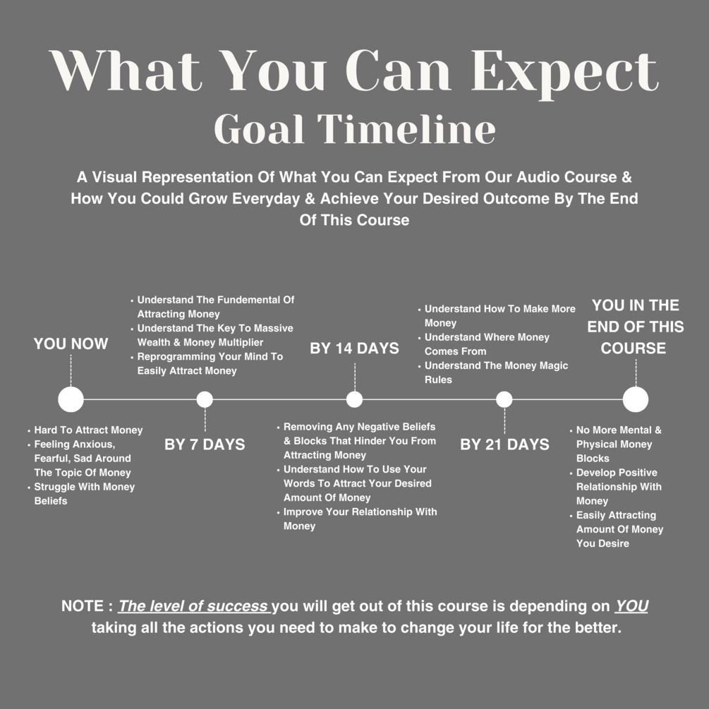 Course Outline : ☑️ Introduction : What To Expect ☑️ Setting Intentions + Reflections ☑️ Understanding Current Money Beliefs vs Your Current Financial Reality ☑️ DAY 1 : Clearing Out The Junk ☑️ DAY 2 : The Word That Will Set You Free ☑️ DAY 3 : Feel Your Way To Money & Abundance ☑️ DAY 4 : The Massive Money & Wealth Multiplier ☑️ DAY 5 : Give Your Money A Purpose ☑️ DAY 6 : Don’t Worry About The “How” it is not your job ☑️ DAY 7 : Negativity Detox ☑️ DAY 8 : Creating Money & Wealth ☑️ DAY 9 : Affirming Your Money Truth ☑️ DAY 10 : Shut The Negative Voices In Your Mind ☑️ DAY 11 : You Must See It Before You See it ☑️ DAY 12 : You Are A Wizard! Your Word Is Your Magic Wand ☑️ DAY 13 : Listen To Your Guts ☑️ DAY 14 : Own IT! ☑️ DAY 15 : The Money & Wealth You Desire Is Already Manifesting & Coming To You ☑️ DAY 16 : Up Your Value, Up Your Income ☑️ DAY 17 : Removing Limiting Beliefs ☑️ DAY 18 : Let’s Scripting! ☑️ DAY 19 : Soo Where The Money Comes From? ☑️ DAY 20 : The Magic 10/10/10 Rule ☑️ DAY 21 : Faith Is Like Wifi