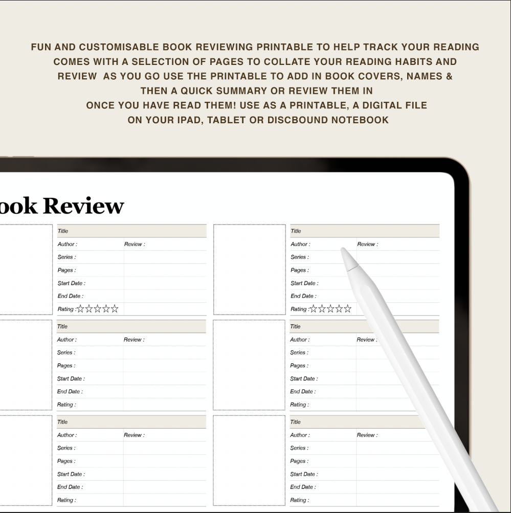 Fun and customisable book reviewing printable to help track your reading! Comes with a selection of pages to collate your reading habits and review as you go. Use the printable to add in book covers, names and then a quick summary or review them in once you've read them! Use as a printable, a digital file on your iPad or tablet, or in a discbound notebook.
